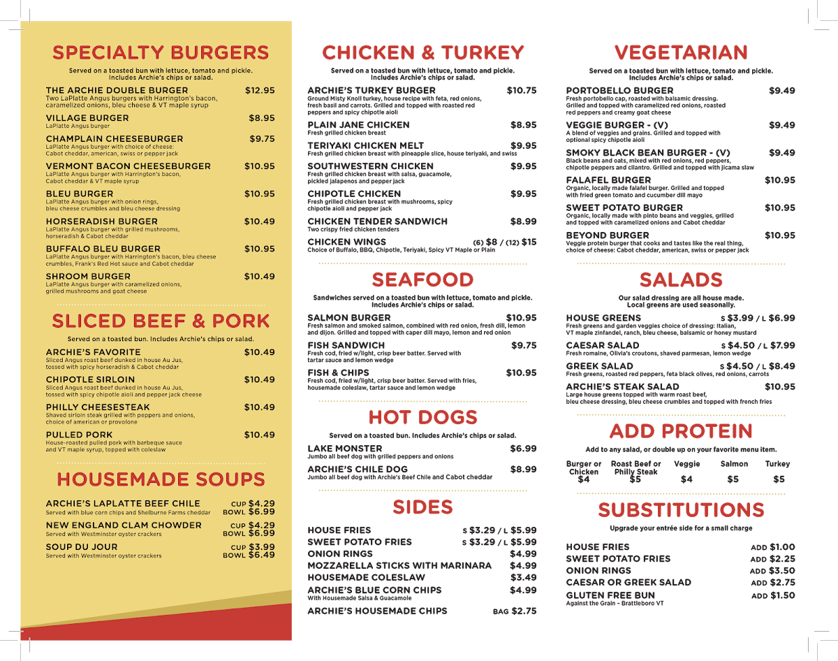 In addition, warm up with housemade soups such as New England Clam Chowder or the flavorful Archie's Laplatte Beef Chile.