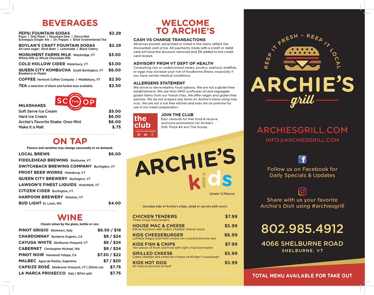 Welcome to Archie's Grill, a hidden gem located at 4066 Shelburne Rd, Shelburne, VT, where culinary craftsmanship meets casual dining. This inviting space combines a polished, modern aesthetic with a relaxed atmosphere, making it the ideal spot for a quick meal or a leisurely lunch.